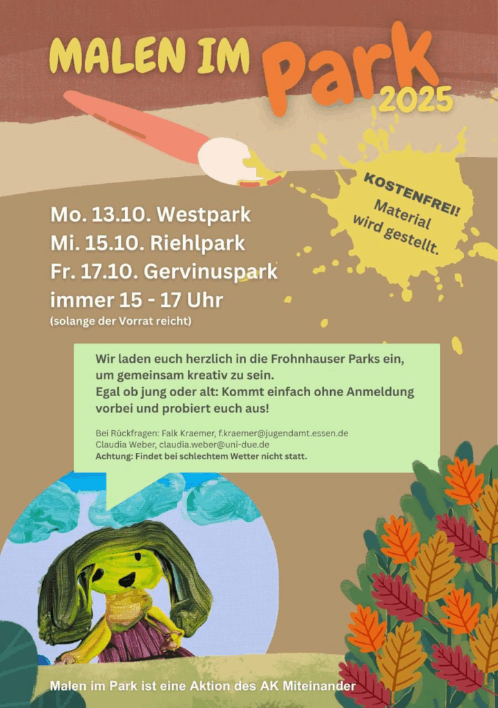 Das Kindertagesfest im Riehlpark fand am 03. Oktober 2025 statt, beginnend ab 11 Uhr. Es war eine Veranstaltung für Kinder und Familien, die leckeres Essen, Getränke sowie zahlreiche Aktionen wie eine Hüpfburg, Riesenschach, Mal- und Kreativangebote und vieles mehr bot.